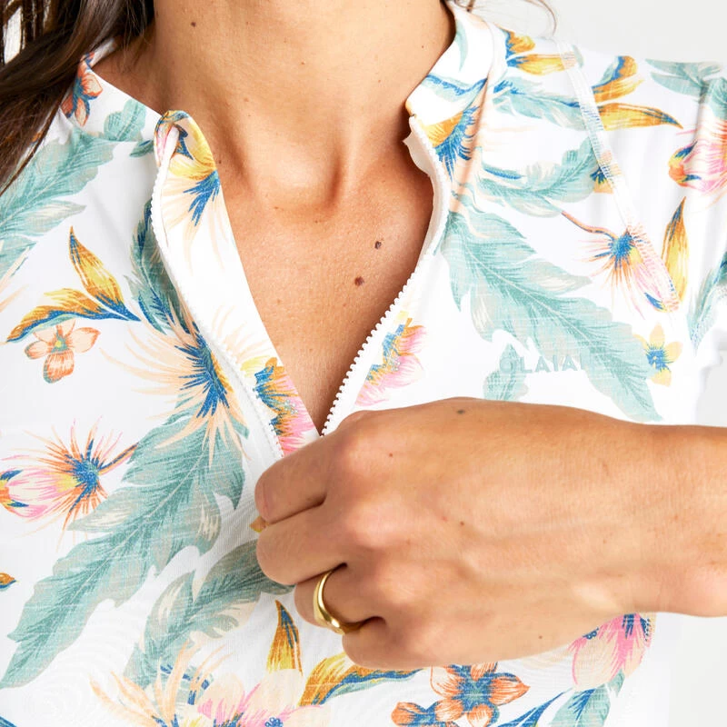 Nous, surfeuses de tous niveaux, avons conçu ce tee shirt anti UV pour la surfeuse confirmée qui surfe les vagues de moins d’un mètre.Tee shirt anti-UV manches longues pour protéger du soleil, même dans l’eau, et limiter les irritations au contact de la planche. Nœuds latéraux d’attache du maillot pour la tenue dans la vague.
